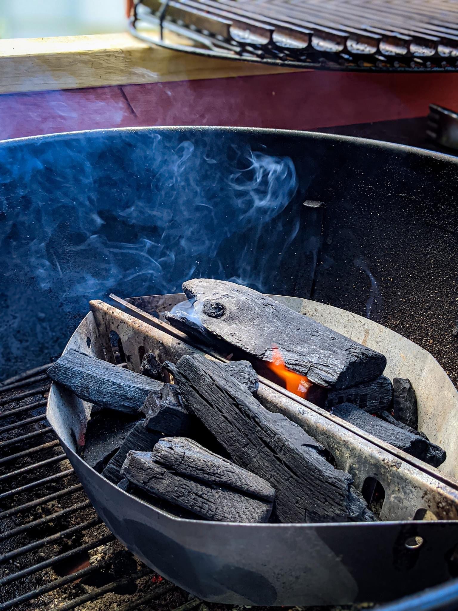 Use a chimney starter to light your coals evenly without lighter fluid. Fill the chimney, use a fire starter such as Royal Oak Tumbleweeds underneath, and light it. Coals are ready when covered in white-gray ash (about 15–20 minutes).