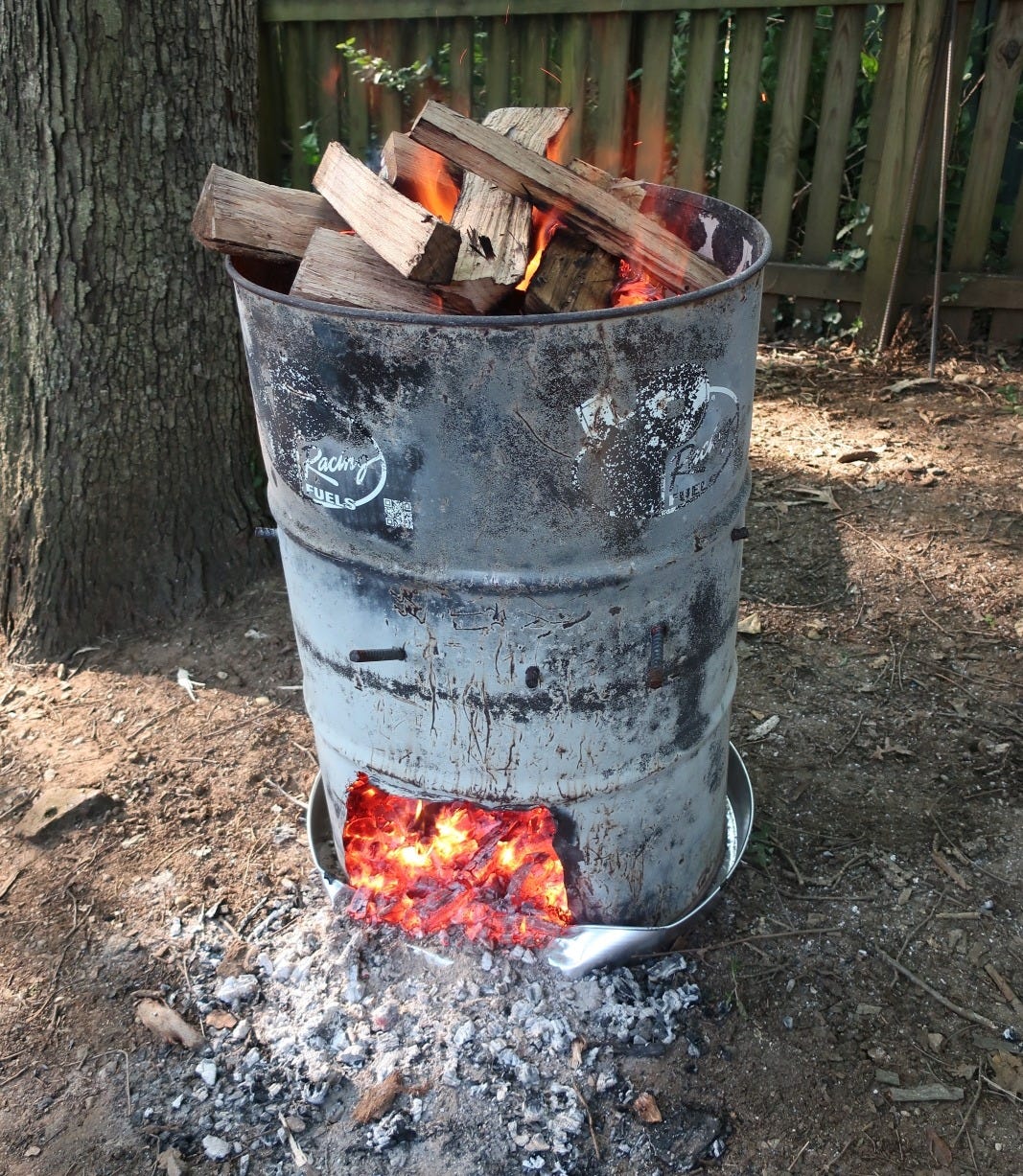One of the lessons learned from the first time around was that I didn't get enough coals going, so I was constantly playing catch-up in terms of waiting for coals to burn down before I could add them to keep the temperature consistent. So much so that Speedy made a middle-of-the-night run to a 24-hour Walmart to pick up a few bags of charcoal to help kickstart the fire. This time around, I'm loading the burn barrel full of wood and will keep adding more while also proactively getting a couple of bags of charcoal in case I need them.